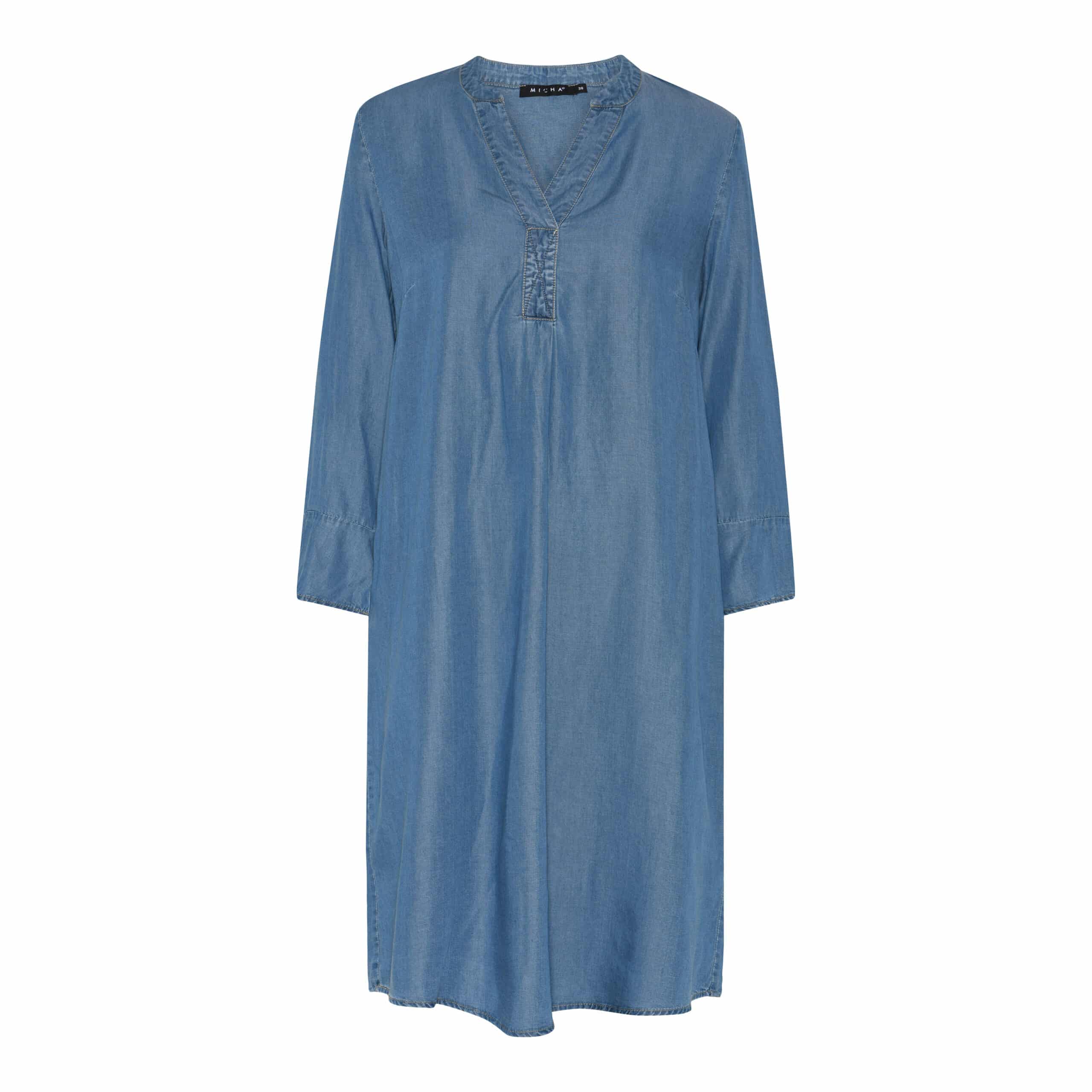 Smart denim farvet kjole fra Micha – Fin tunika kjole i lækker, let lyocell kvalitet – Med V-udskæring og 3/4 lange ærmer med flæsekant.