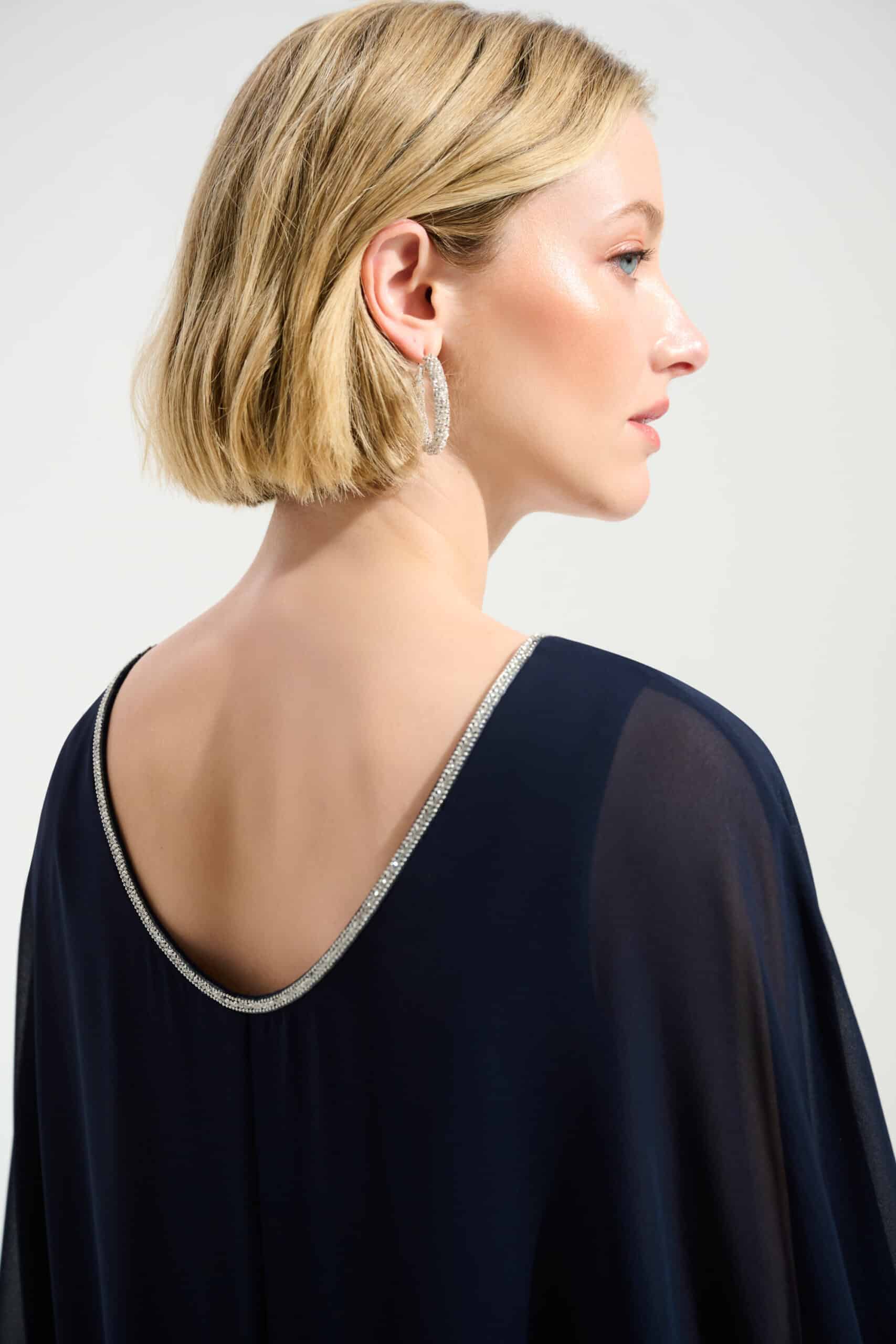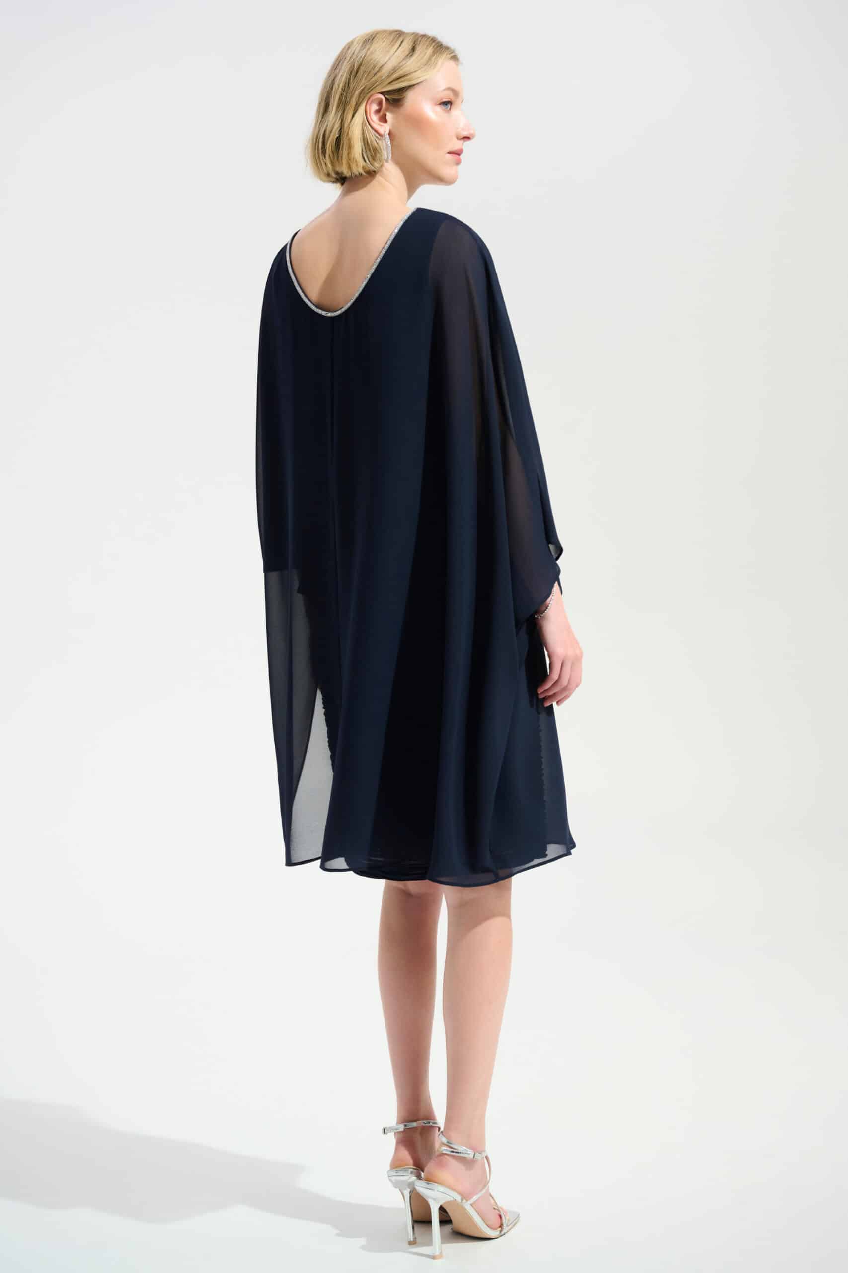 Smuk navy selskabskjole fra Joseph Ribkoff – Elegant chiffon slag der også udgør et kort ærmer – Dyb udskæring i ryggen med feminin similikant.
