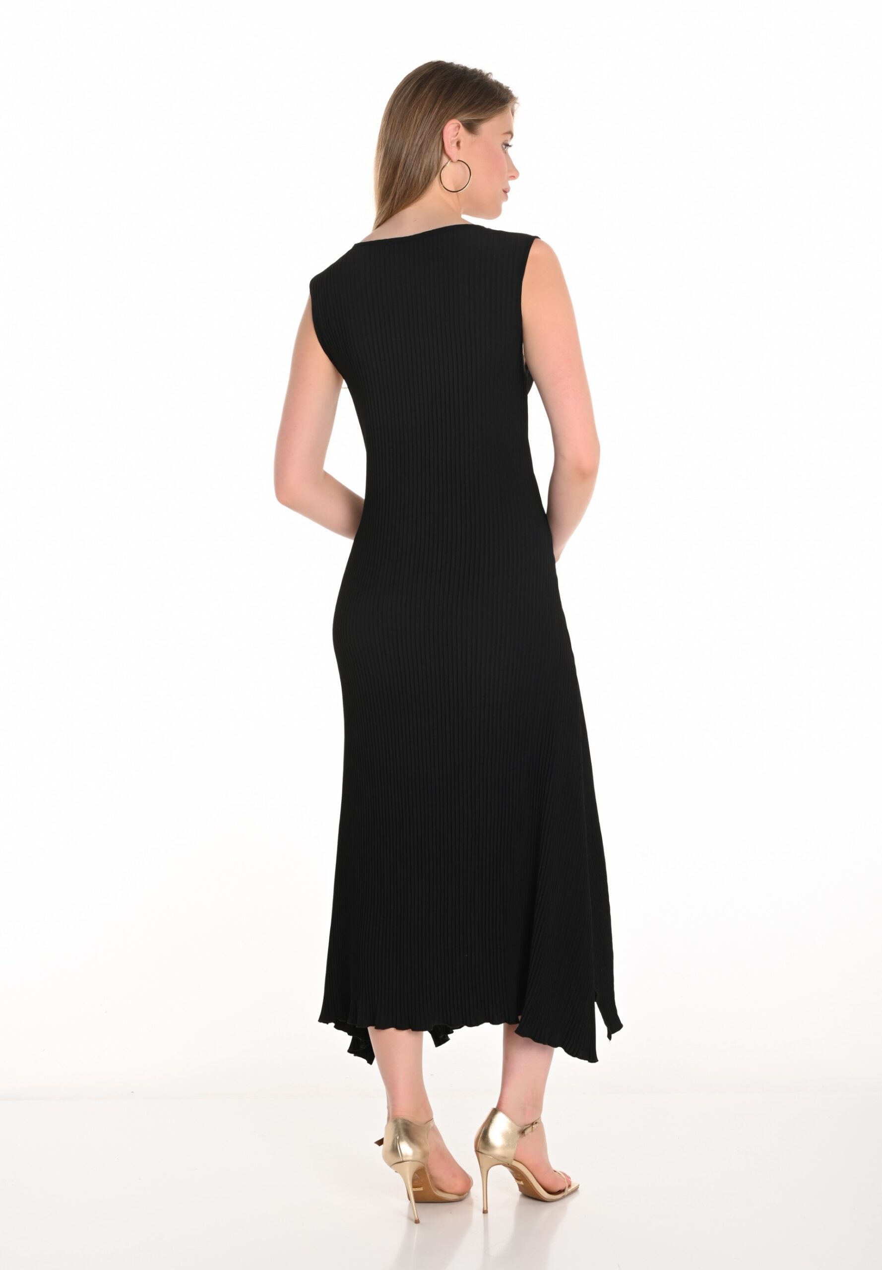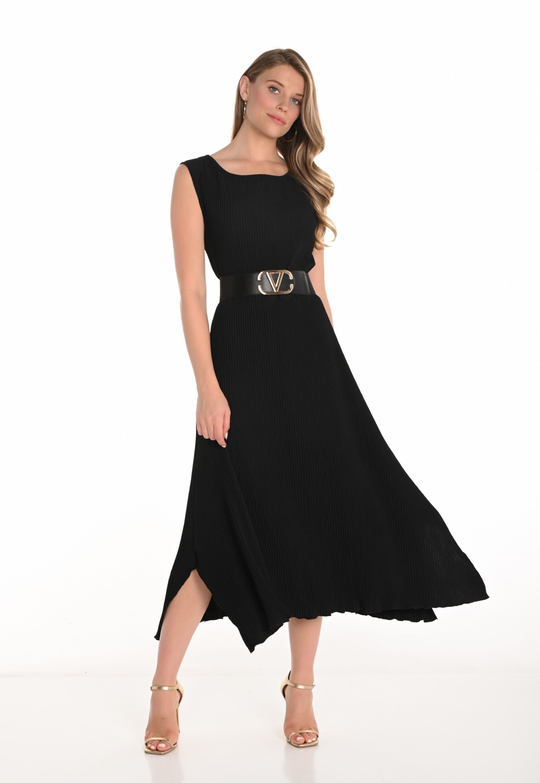 Elegant sort plisse kjole fra Frank Lyman – Enkelt sort kjole med rund hals og uden ærmer – Smart skørt med vidde og asymmetriske længder – Kan styles både råt og feminint.
