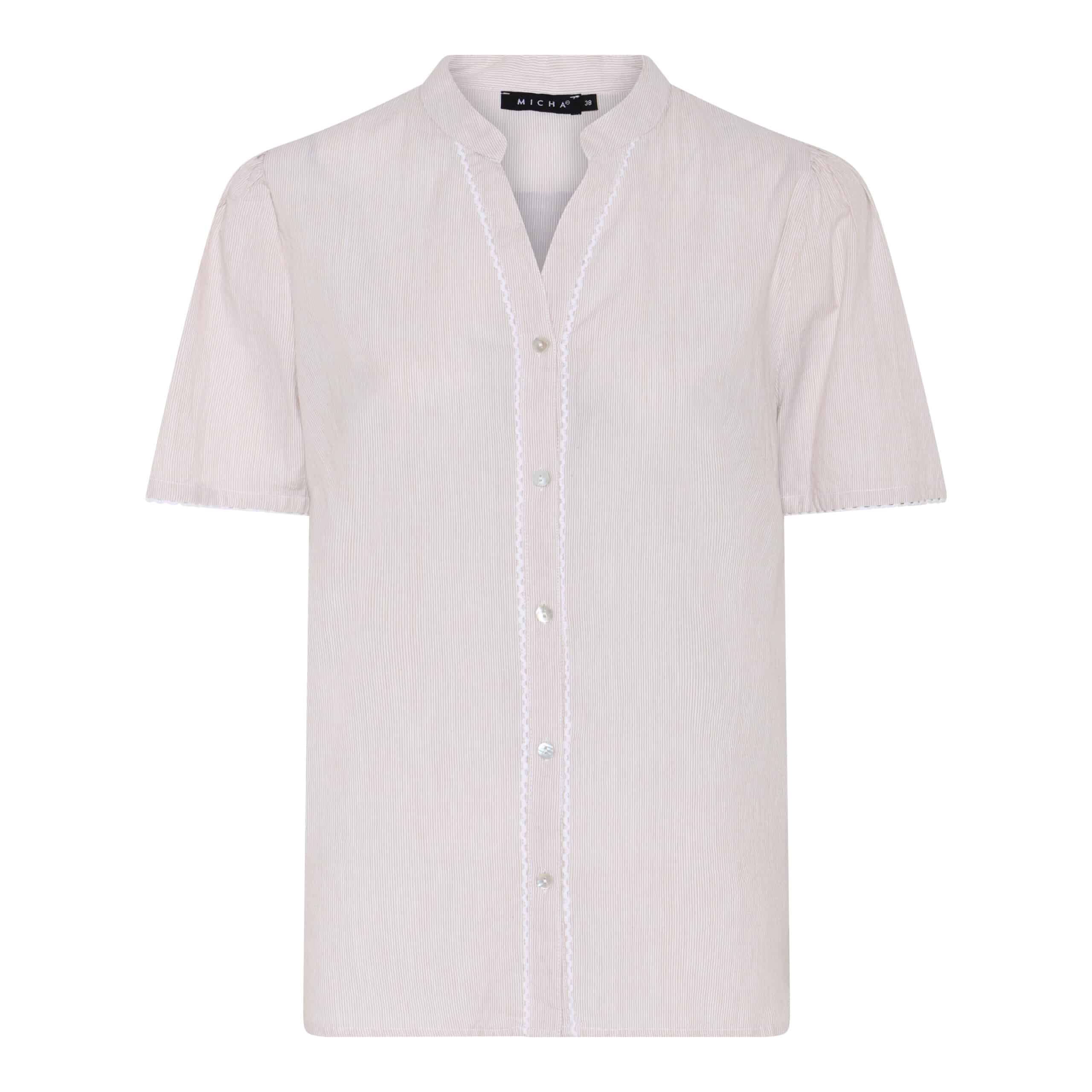 Sød skjorte fra Micha – Klassisk skjorte i lækker bomulds kvalitet – Gennemknappet med v-hals og korte ærmer i sandfarvede og hvide striber.