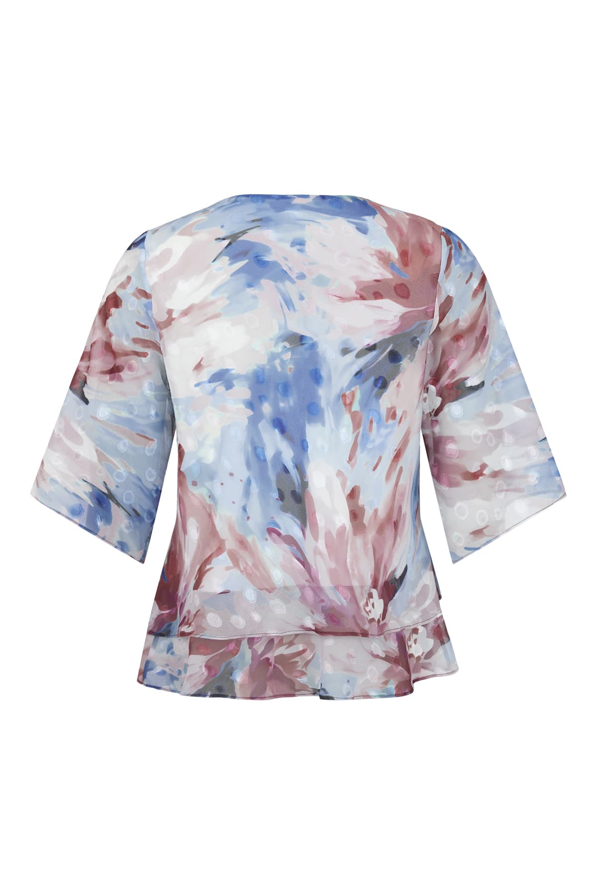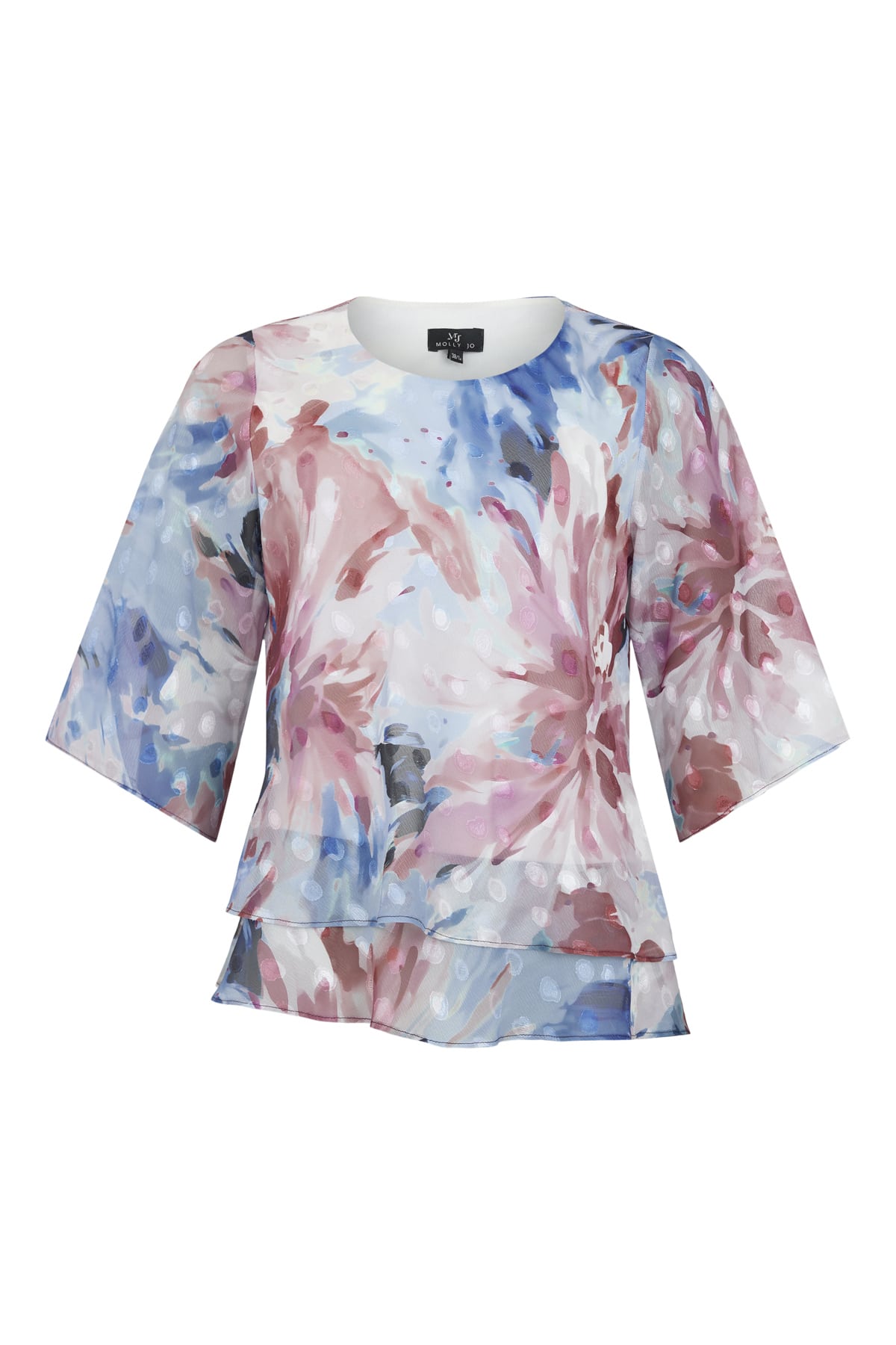Elegant selskabs top fra Molly Jo – Smuk print i lyse, blå og lyngfarvede nuancer – elegant chiffon selskabstop top med 3/4 ærmer og etager forneden.