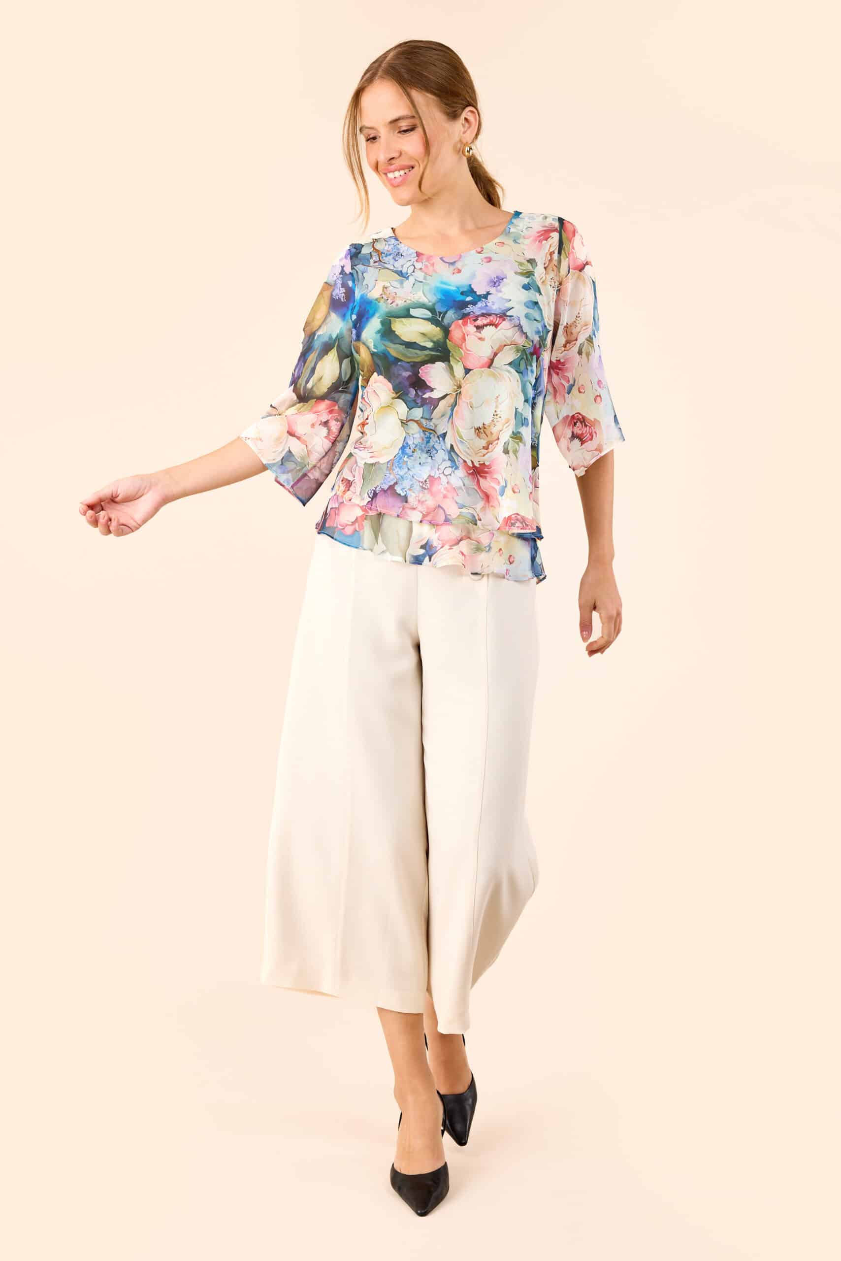 Elegant selskabs top fra Molly Jo – Smukt blomsterprint i mange lyse farver – elegant chiffon selskabstop top med 3/4 ærmer og etager forneden.