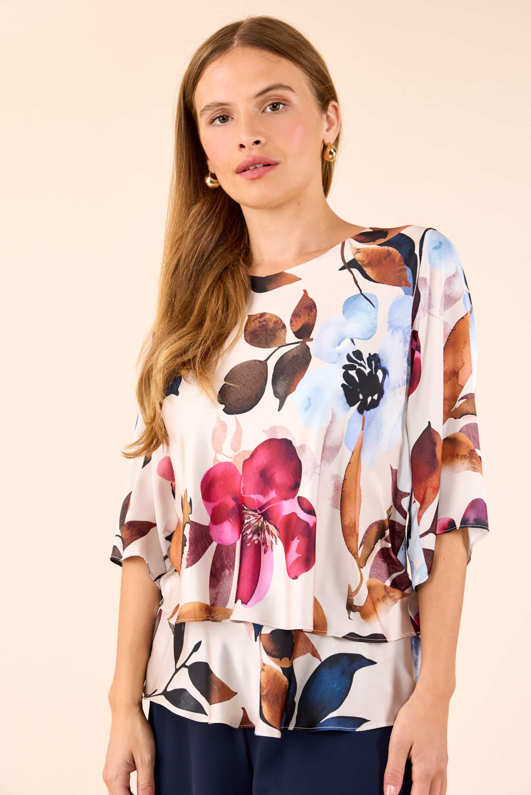 Elegant selskabs top fra Molly Jo – Smukt blomsterprint med mange nuancer – elegant selskabstop top med 3/4 ærmer og etager forneden.