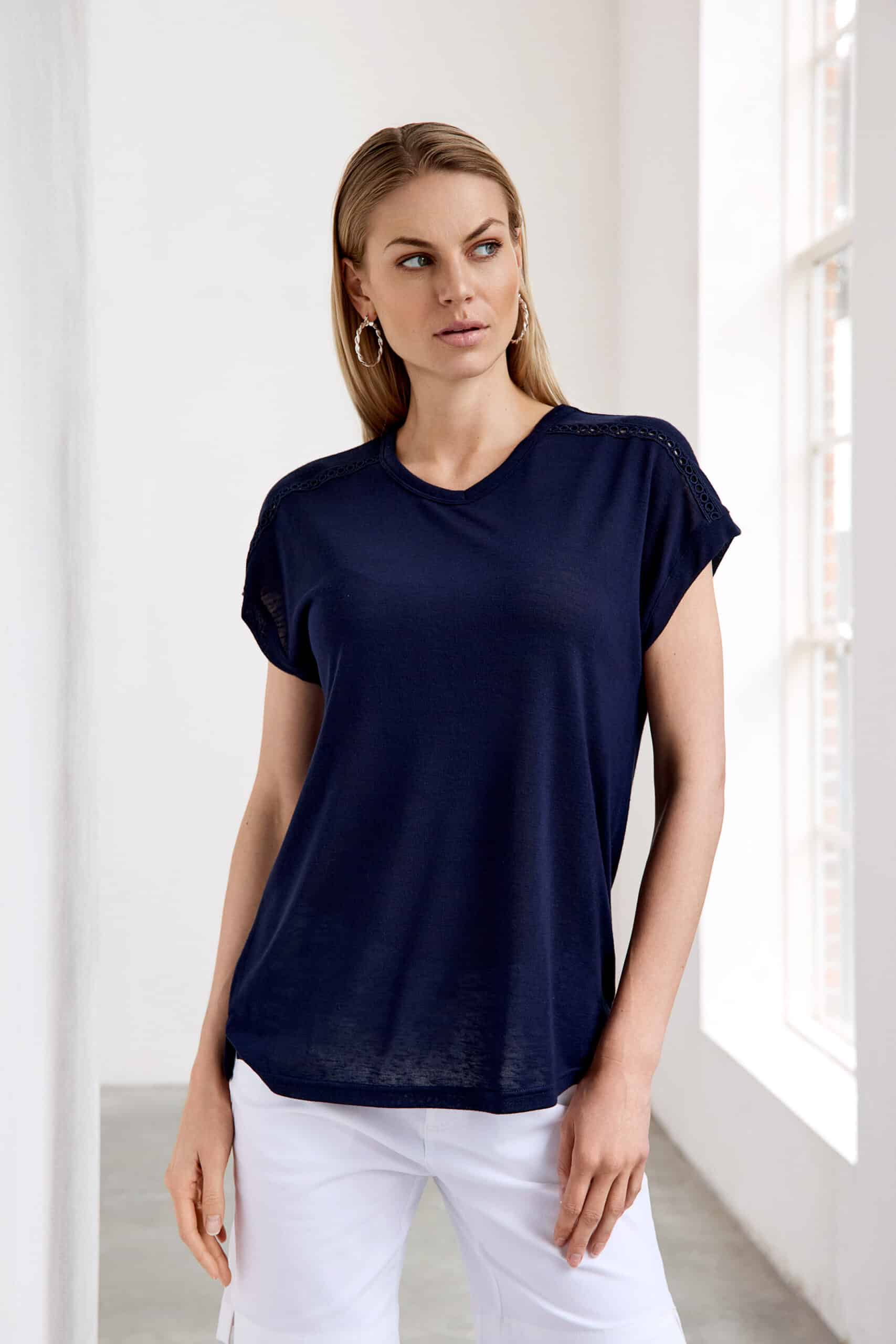 Micha sommer t-shirt med fine detaljer – Lækker let hør bluse med v- hals og korte ærmer – Fint kantbånd ved skulder med transparant effekt.