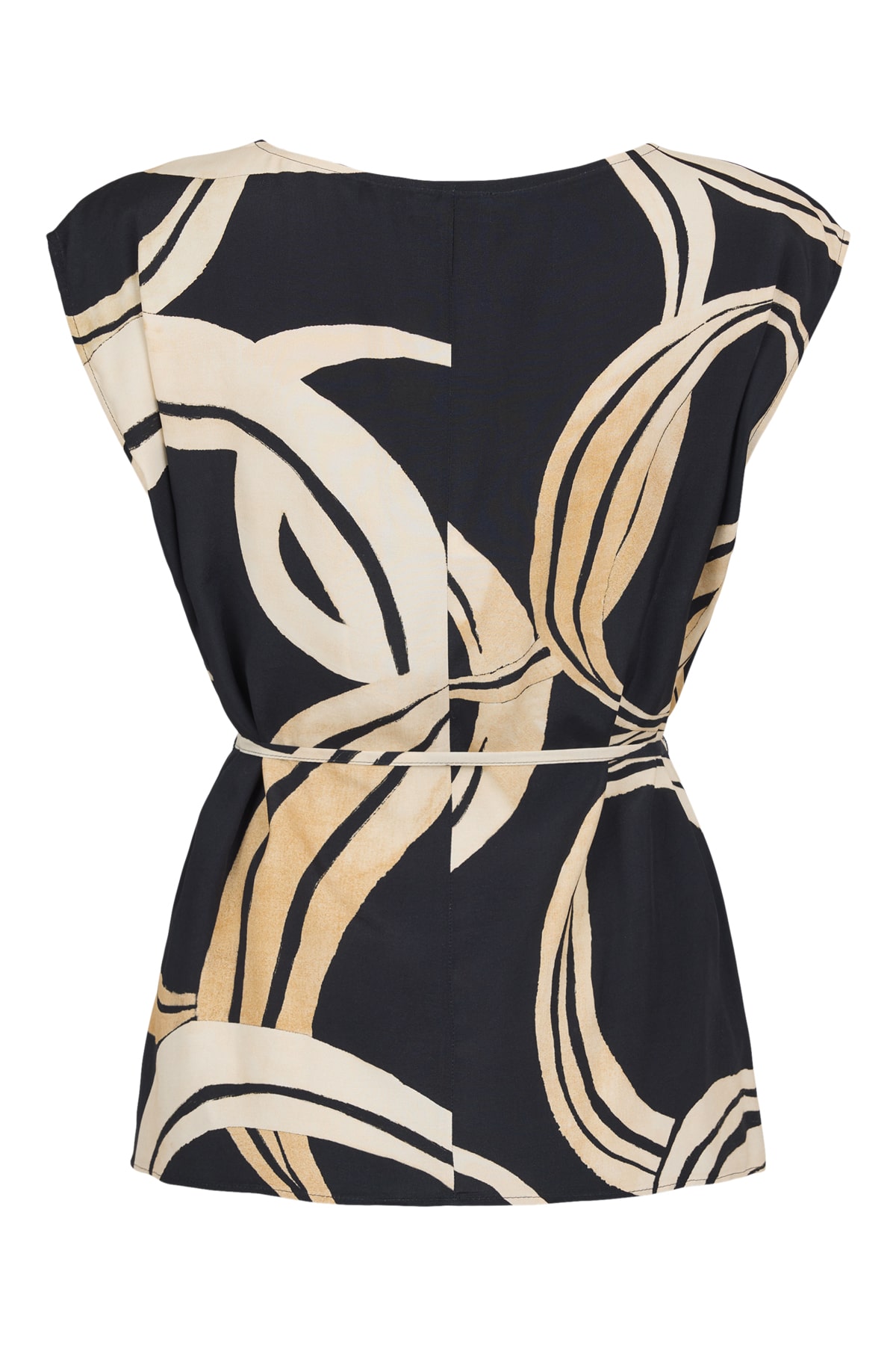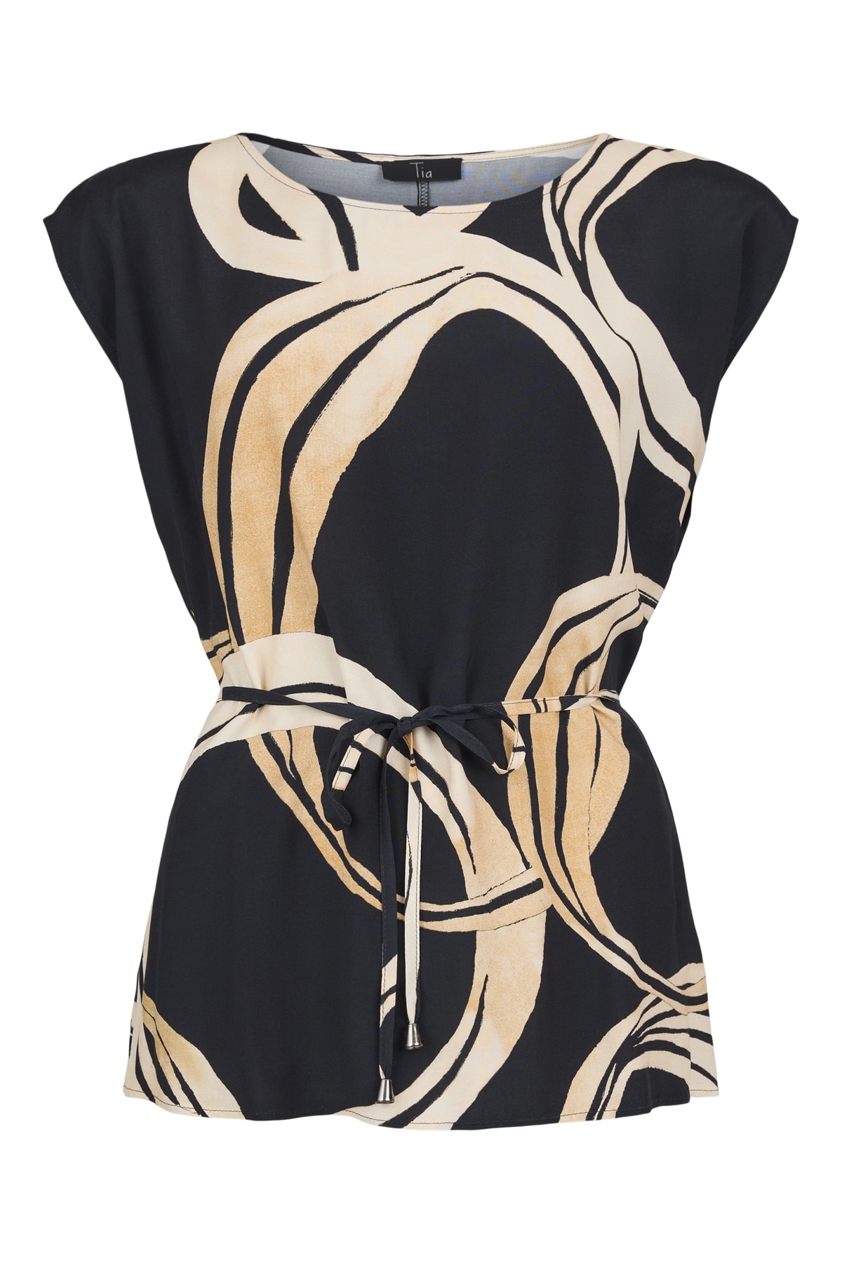 Elegant top fra Tia – Flot grafisk print i sandfarvede nuancer på sort bund – Lækker åndbar viskose kvalitet – Bindebånd i taljen.