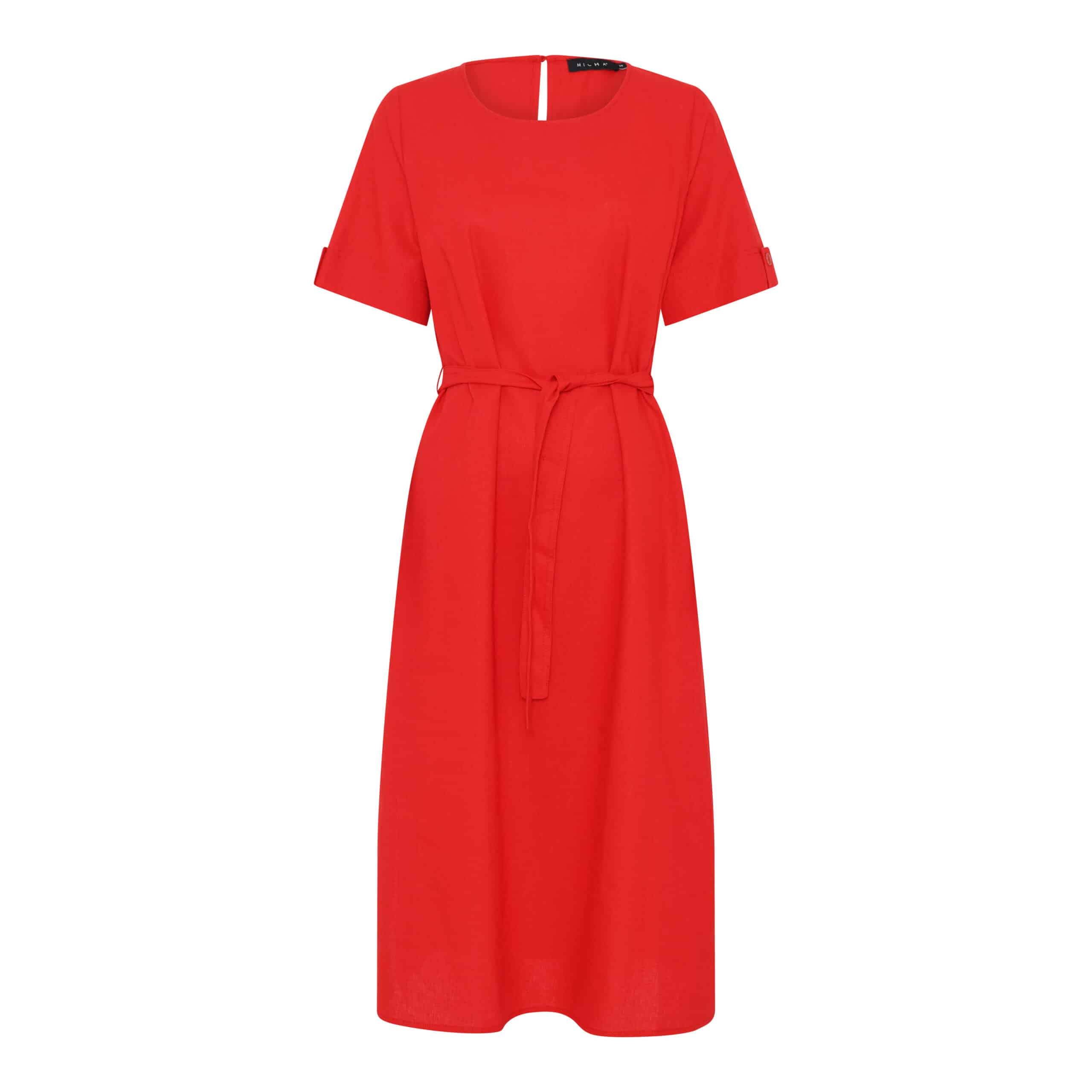 Flot rød kjole kjole fra Micha – Let sommer kjole i lækker hørkvalitet – Klassisk kjole med rund hals og korte ærmer – Fin talje markering.