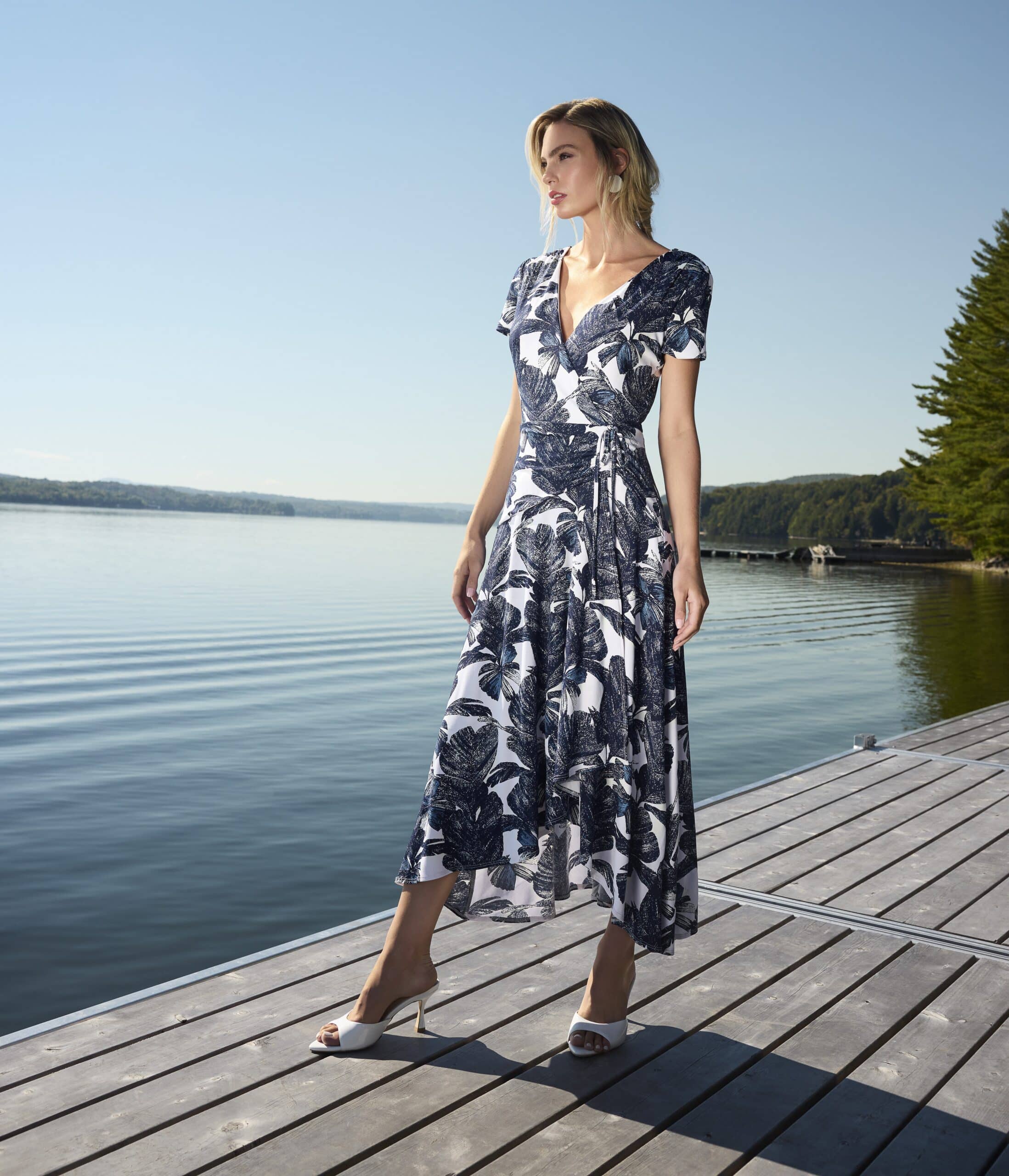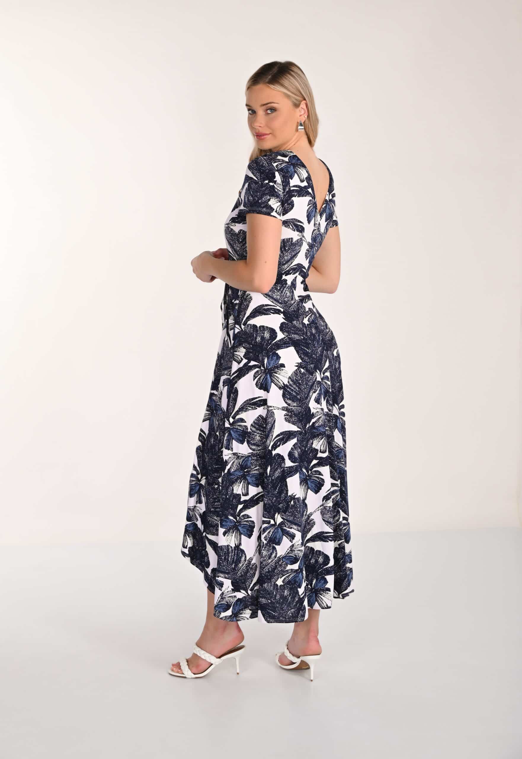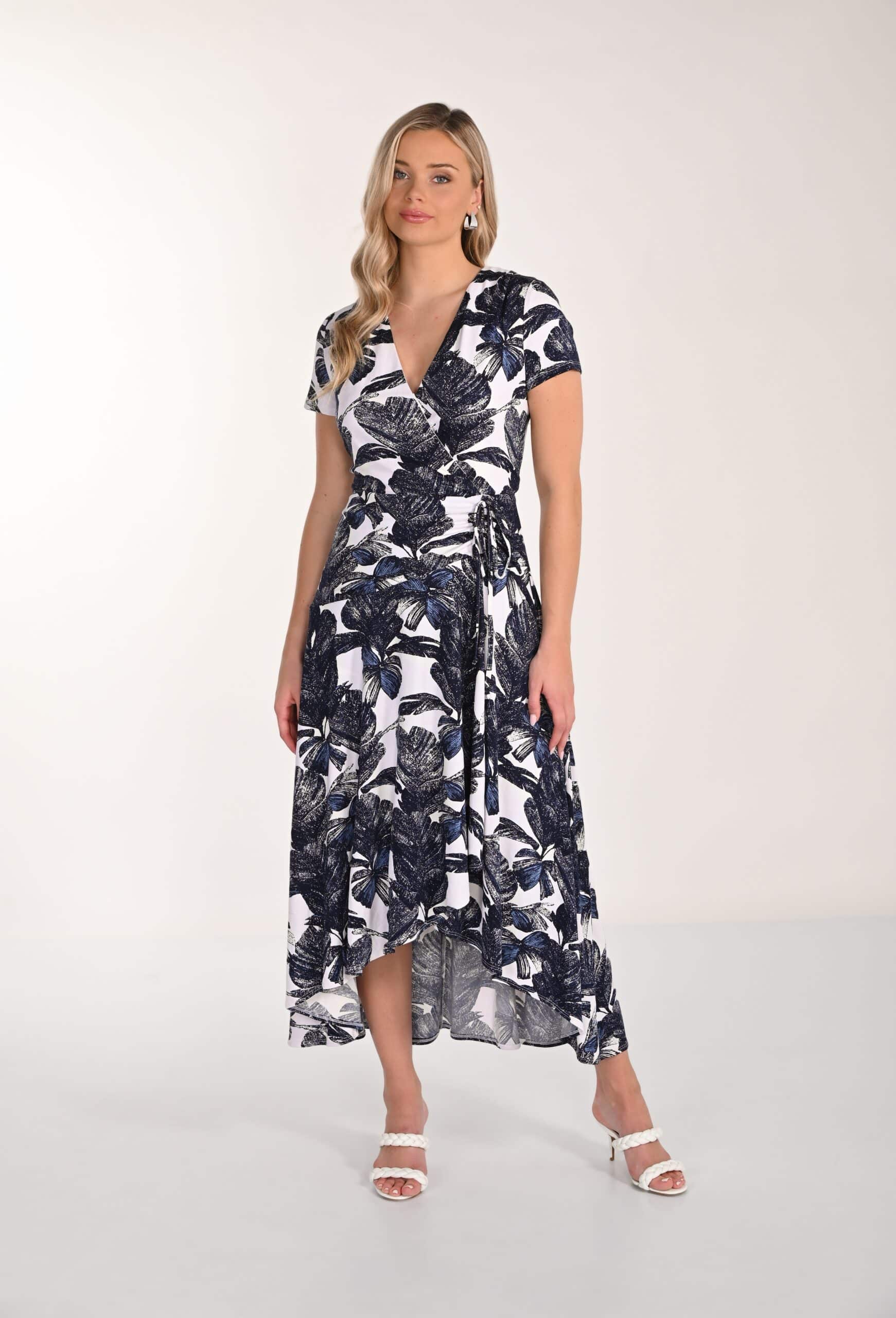 Smart blomstret kjole fra Frank Lyman – Flot kjole i hvide og blå nuancer med fint stor blomstret print – Med V-udskæring og korte ærmer.