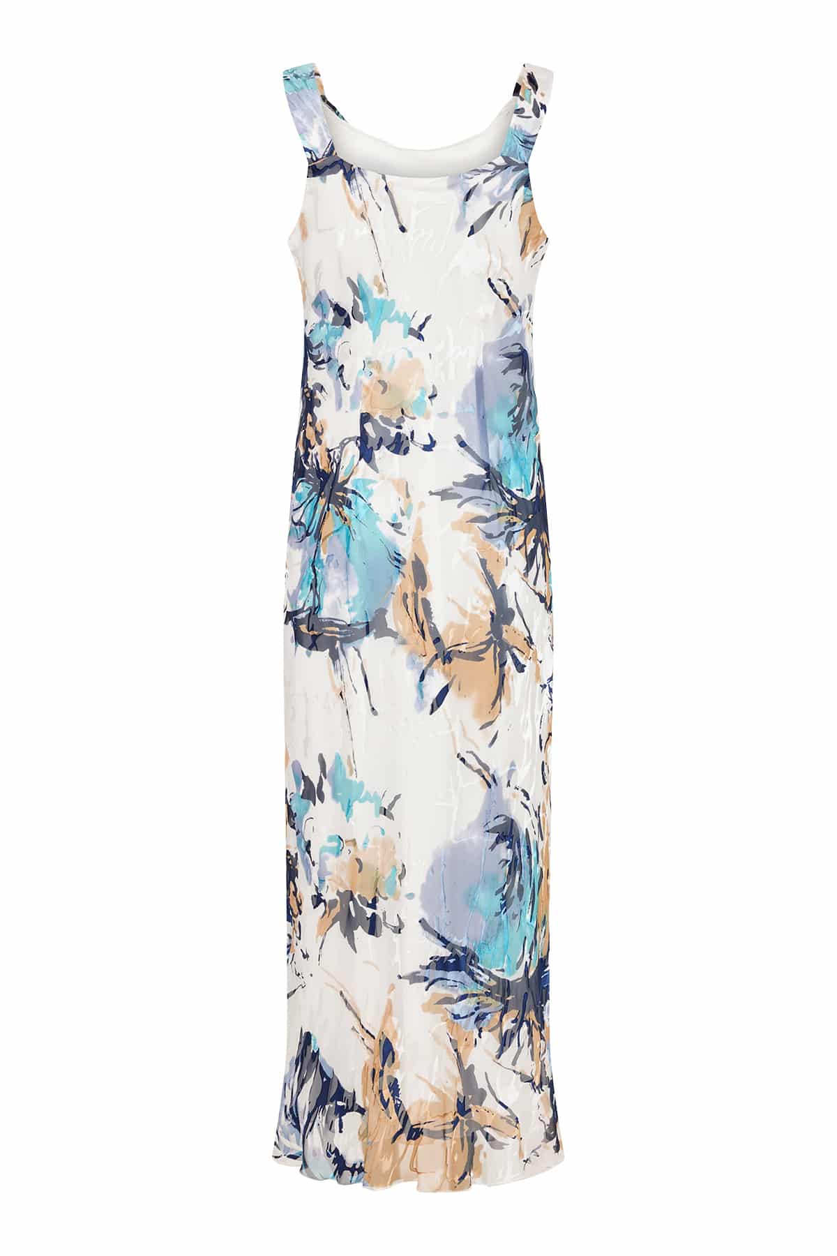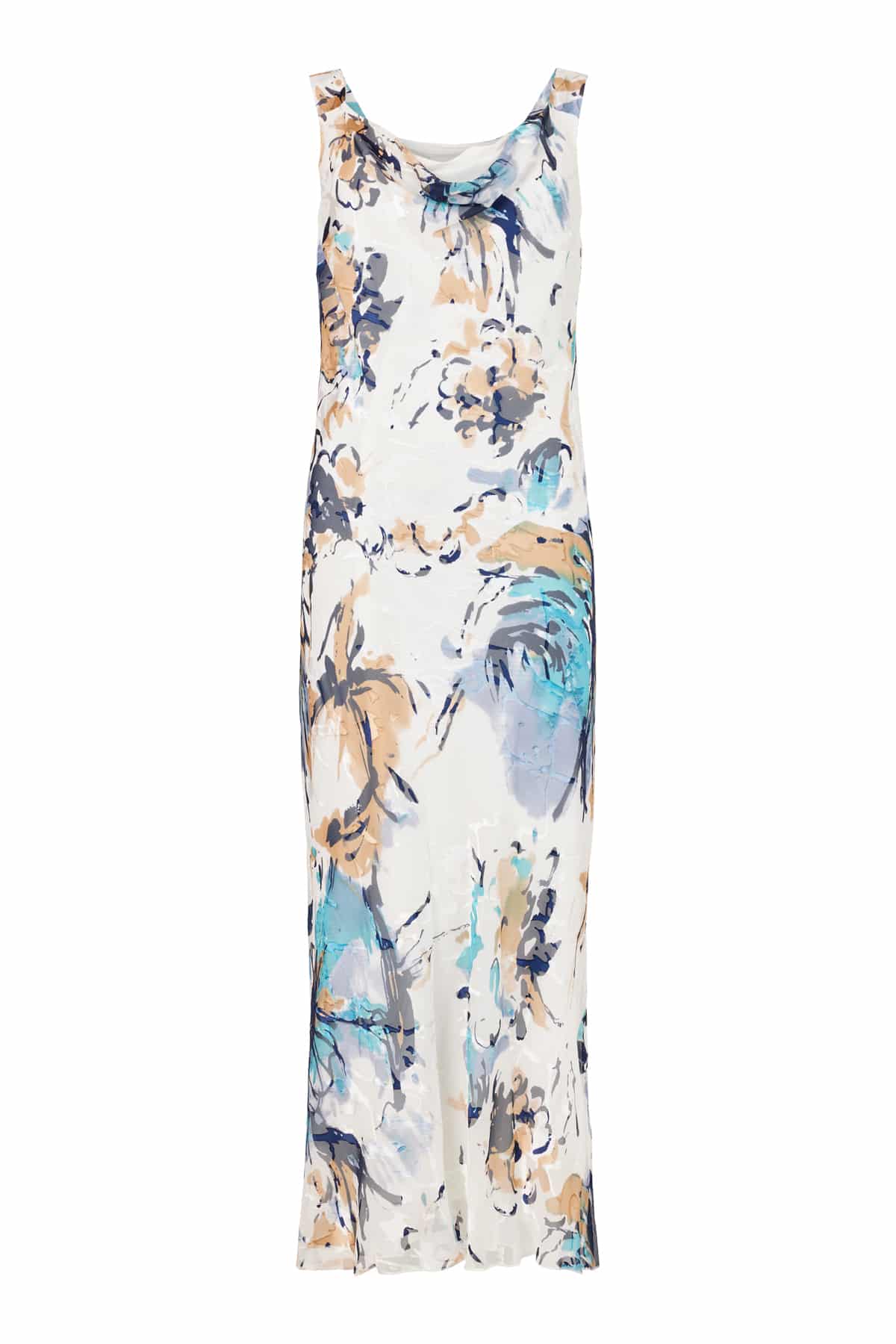 Smuk lang printet festkjole fra Godske – Fantastisk burnout silke i blålige nuancer på lys bund – Super god pasform og let og lækkert udtryk.
