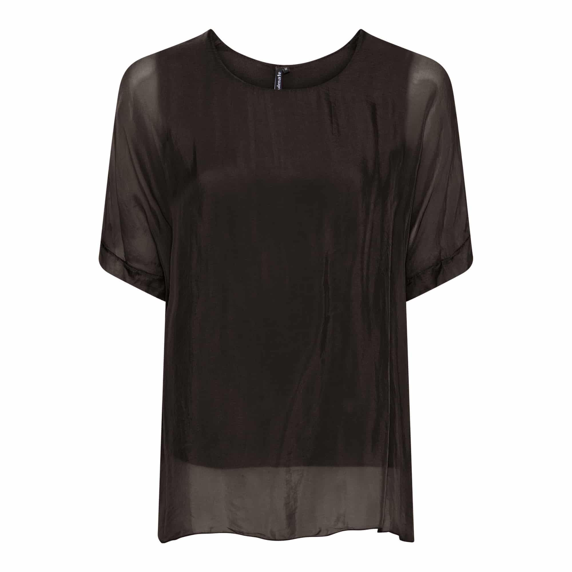 Super smuk brun bluse fra Soulmate – Lækker silke-viskose kvalitet der både er åndbart og giver et florlet udtryk – Med rund hals og korte ærmer.