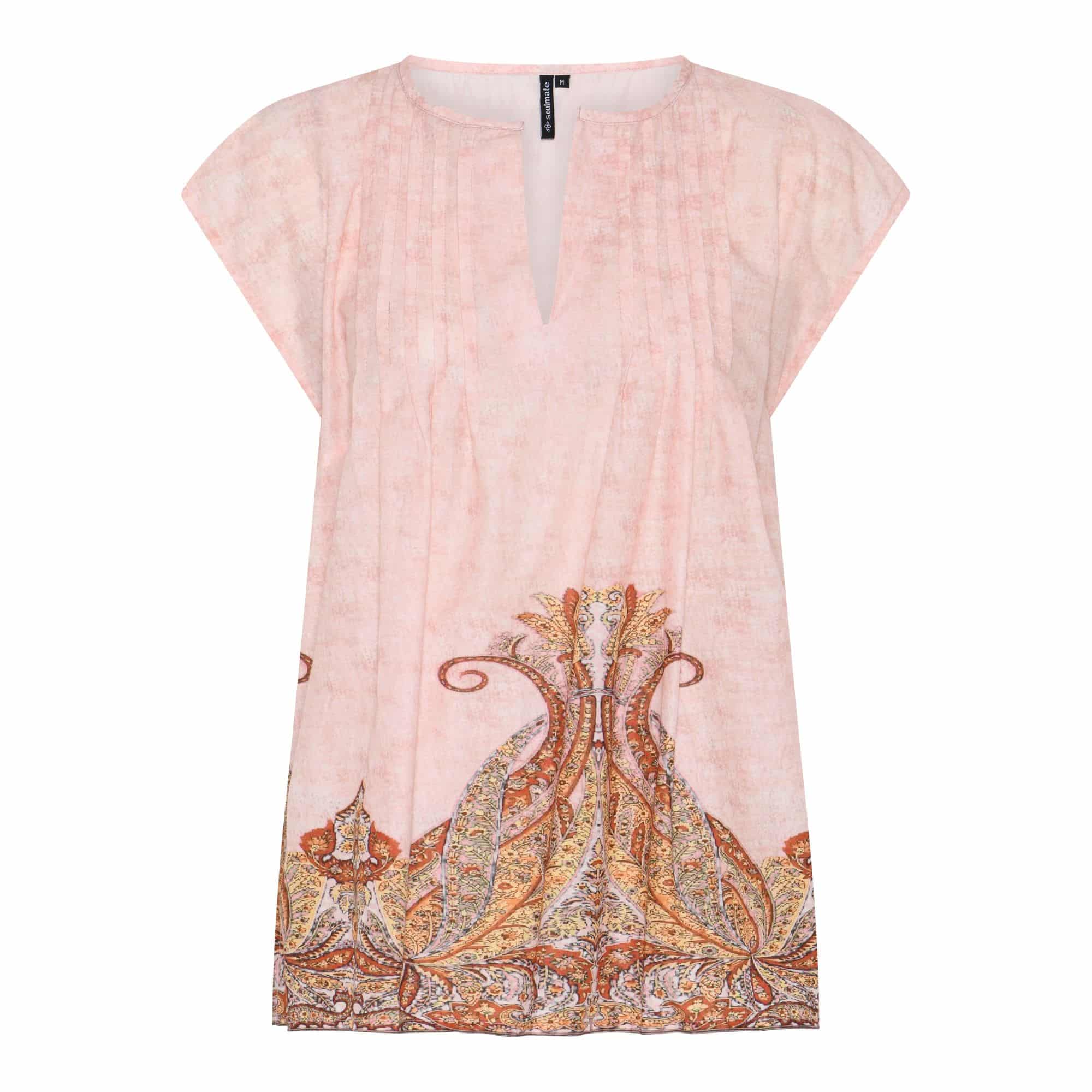 Fin sommer bluse fra Soulmate – Super flot udtryk med rosa foroven og print i brune og sandfarvede nuancer forneden -Let og åndbar bomulds kvalitet.
