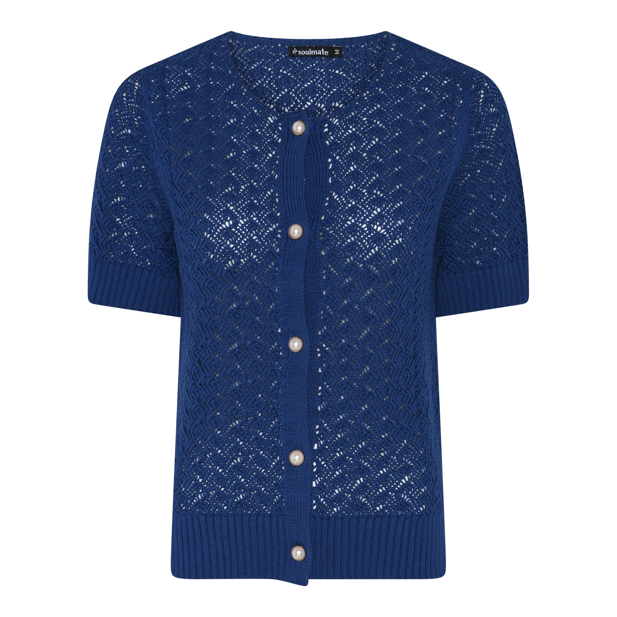 Lækker forårs cardigan fra Soulmate – Klassisk hulstrik i lækker bomulds kvalitet – Gennemknappet med rund hals og korte ærmer – Flot blå farve.