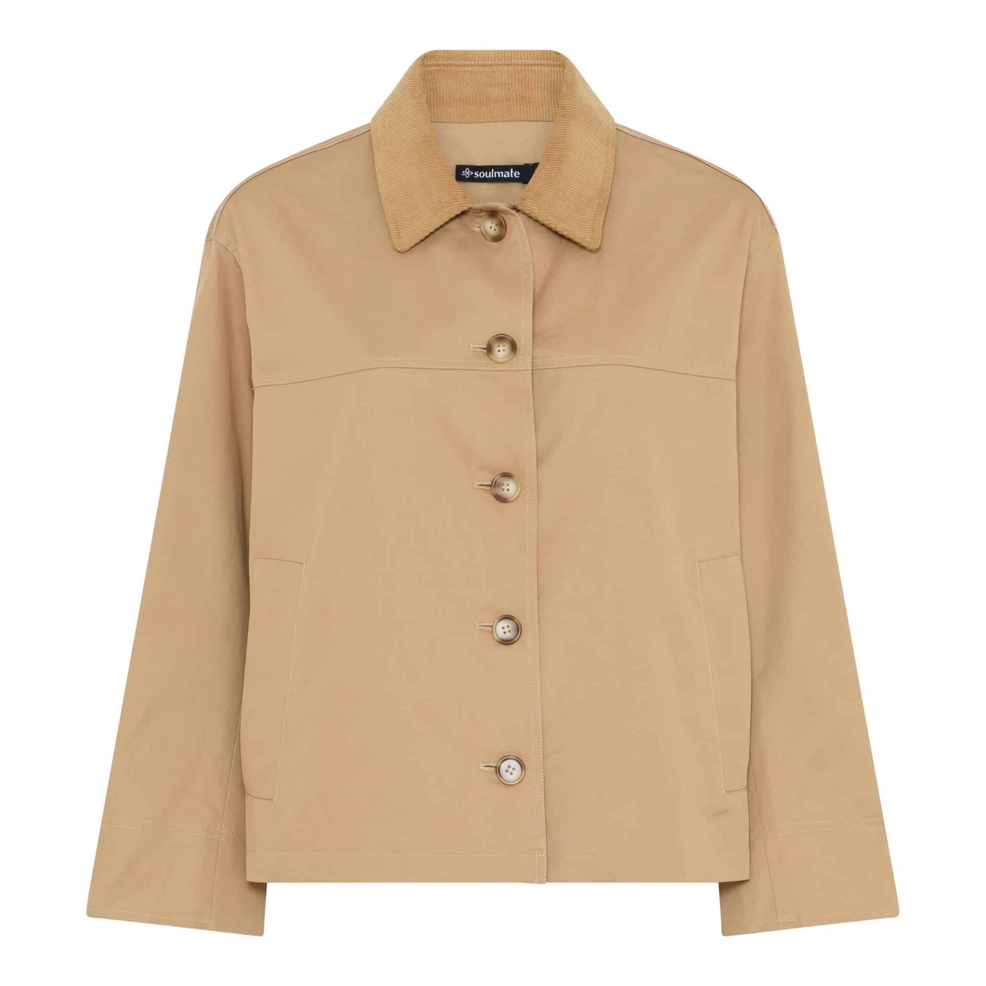 Flot sandfarvet forårs jakke fra Soulmate – Klassisk udtryk med krave, gennemknappet og lange ærmer – Let oversize i lækker bomuldskvalitet.