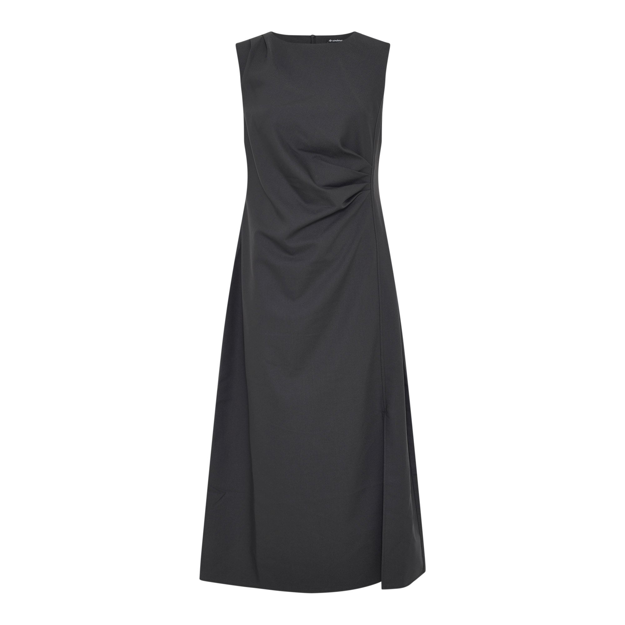 Sort kjole fra Soulmate – Klassisk mellemlang kjole med rund hals og uden ærmer – Flot pasform med drapering foran og vidde i skørtet.