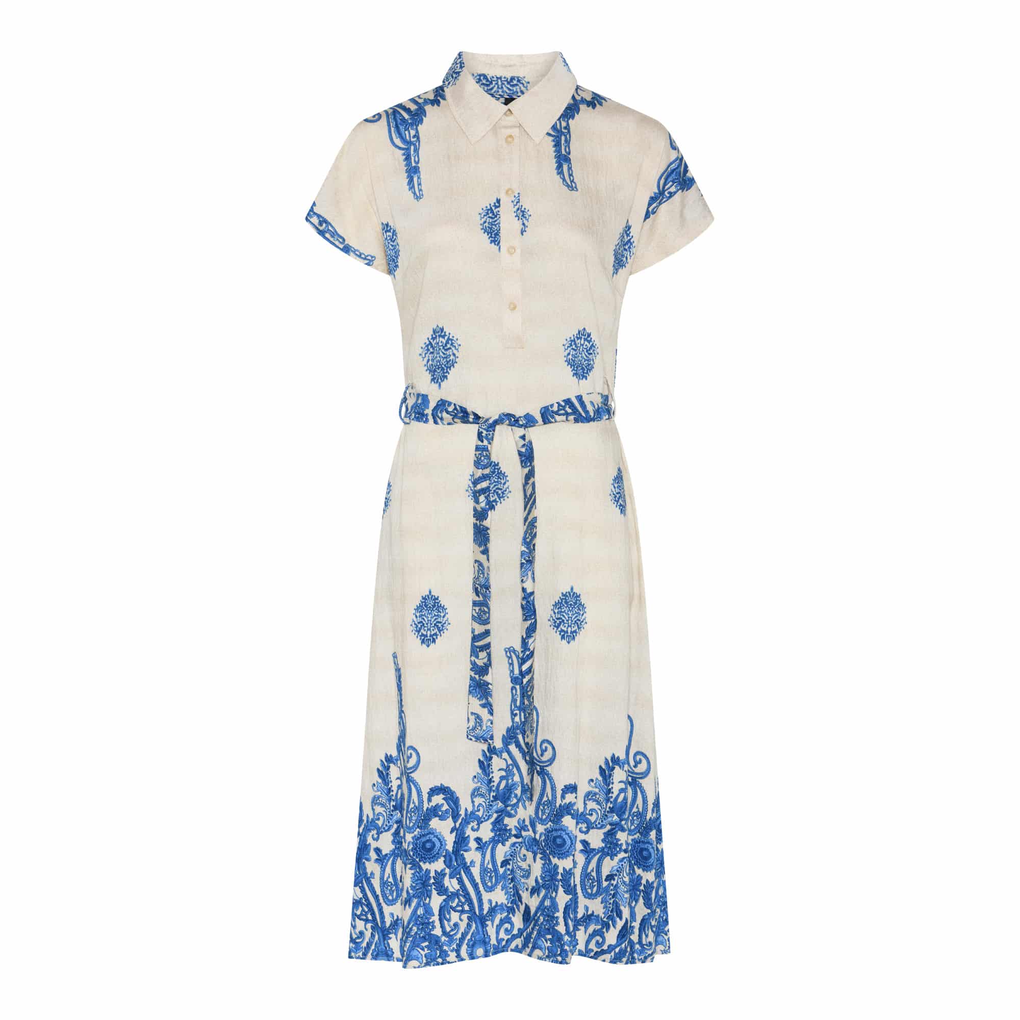 Sød printet skjorte kjole fra Soulmate – Smukt cobol blåt print på lys bund – Klassisk udtryk med krave og korte ærmer. Lækker viskose kvalitet.