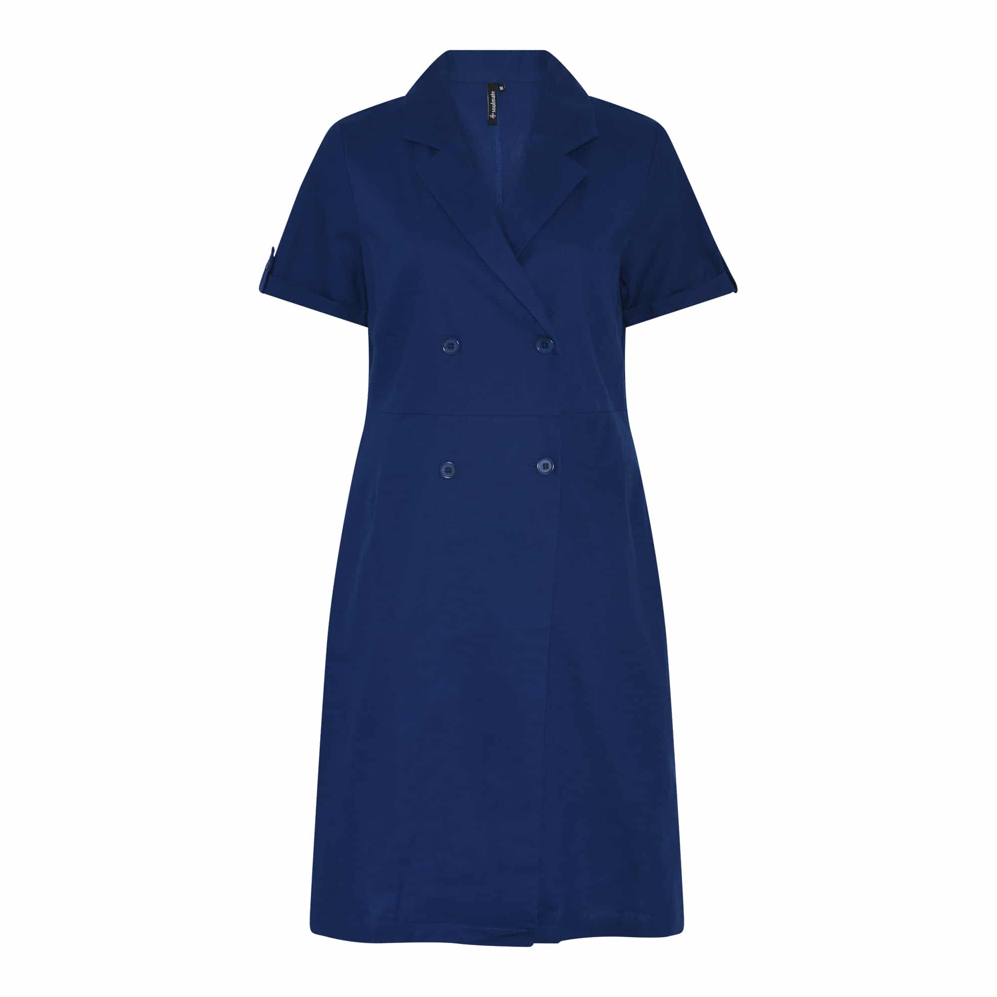 Flot blå forårskjole fra Soulmate – Klassisk udtryk med krave og korte ærmer – Slå-om effekt med dobbeltradet knap lukning.