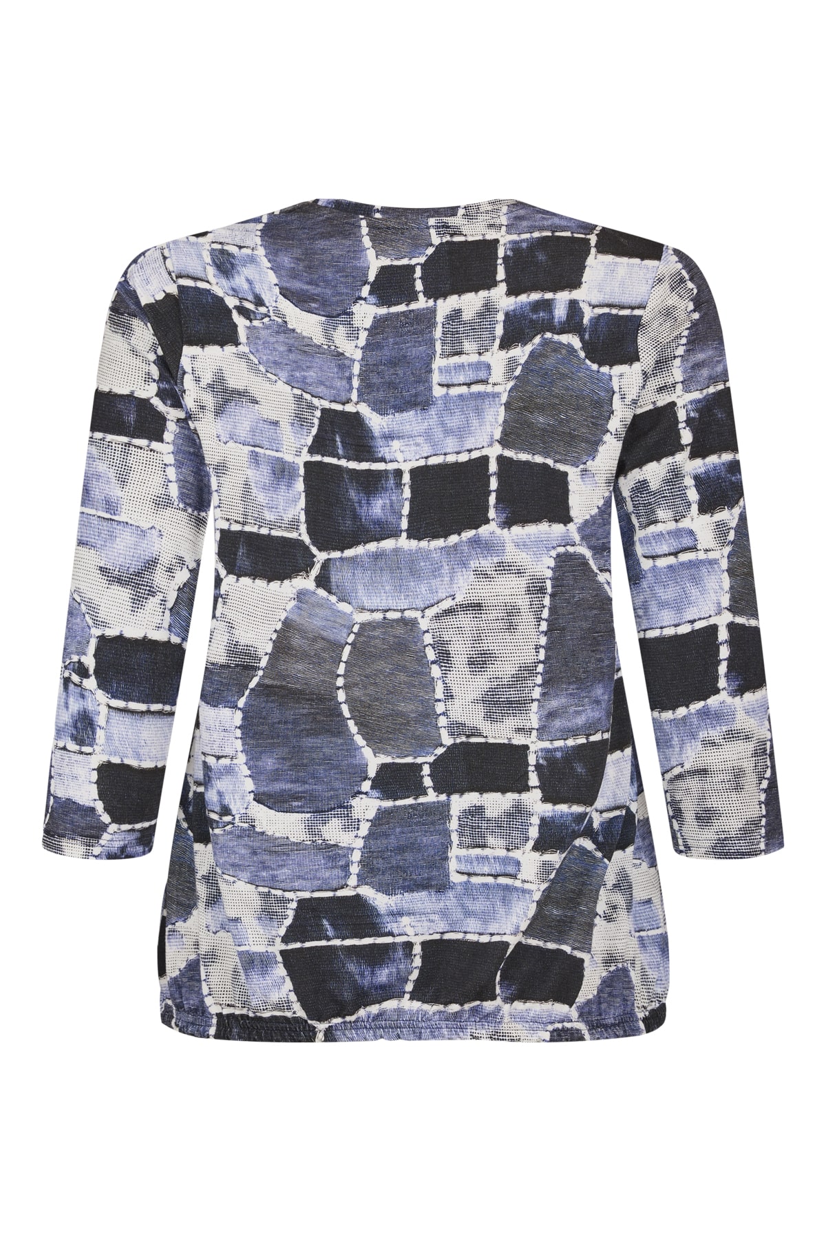 Flot viskose t-shirt fra Sunday i blå og grå nuancer – Flot grafisk print i mørke farver – Rund hals og 3/4 lange ærmer med elastik forneden.