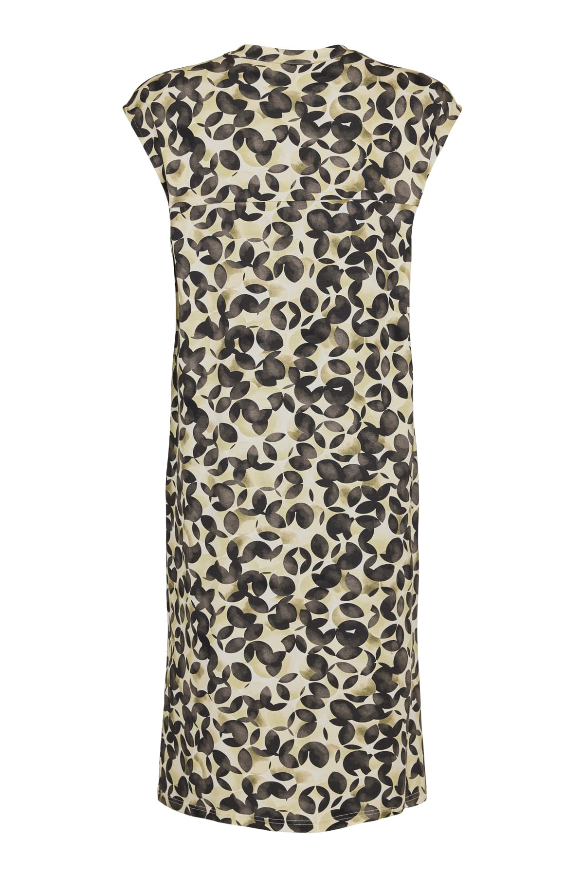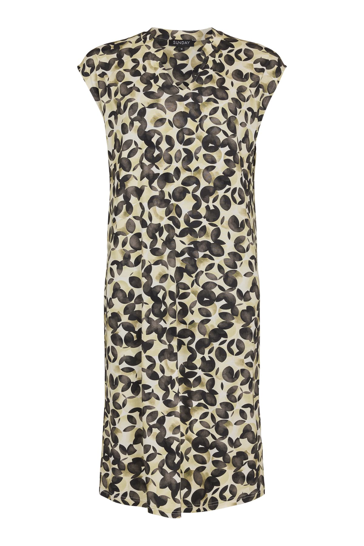 Smart kjole fra Sunday med sort print – Lækker viskosekvalitet med flot grafisk print på gylden baggrund – v-hals og uden ærmer.